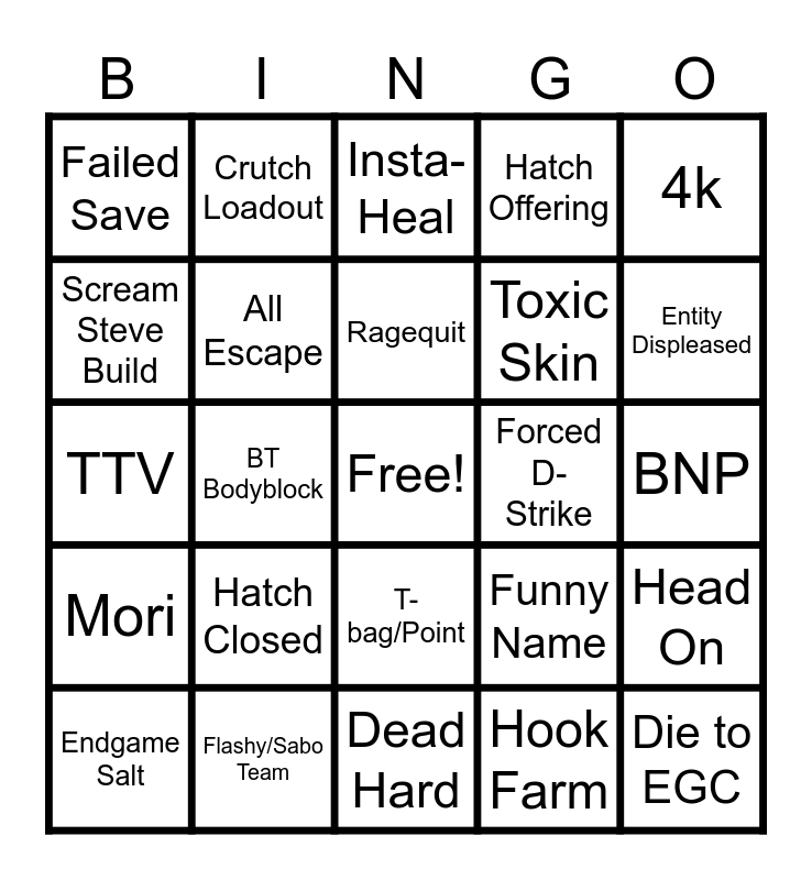 This bingo card has a free space and 24 words: Hatch Closed, Flashy/Sabo Team, Ragequit, Endgame Salt, 4k, Failed Save, Scream Steve Build, Crutch Loadout, Forced D-Strike, T-bag/Point, Toxic Skin, TTV, Funny Name, Head On, All Escape, Hook Farm, BNP, Insta-Heal, Entity Displeased, BT Bodyblock, Die to EGC, Mori, Hatch Offering and Dead Hard.