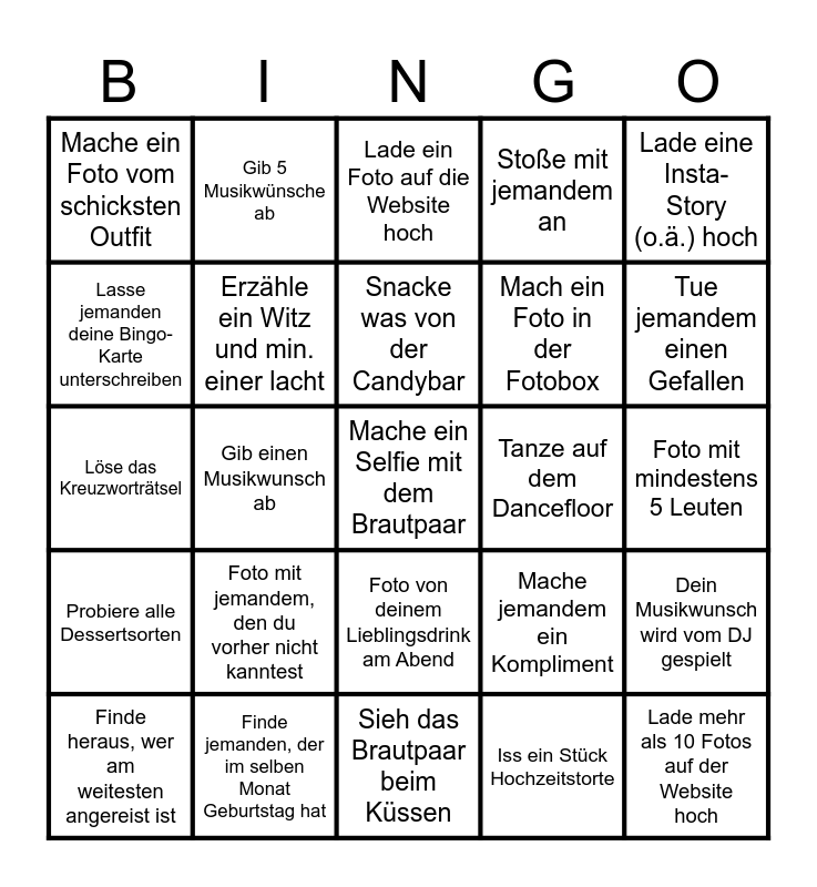 This bingo card has 25 words: Foto mit jemandem, den du vorher nicht kanntest, Sieh das Brautpaar beim Küssen, Snacke was von der Candybar, Finde heraus, wer am weitesten angereist ist, Lade eine Insta-Story (o.ä.) hoch, Mache ein Foto vom schicksten Outfit, Lasse jemanden deine Bingo-Karte unterschreiben, Gib 5 Musikwünsche ab, Tanze auf dem Dancefloor, Foto von deinem Lieblingsdrink am Abend, Mach ein Foto in der Fotobox, Löse das Kreuzworträtsel, Mache jemandem ein Kompliment, Dein Musikwunsch wird vom DJ gespielt, Erzähle ein Witz und min. einer lacht, Lade mehr als 10 Fotos auf der Website hoch, Foto mit mindestens 5 Leuten, Lade ein Foto auf die Website hoch, Tue jemandem einen Gefallen, Gib einen Musikwunsch ab, Mache ein Selfie mit dem Brautpaar, Finde jemanden, der im selben Monat Geburtstag hat, Probiere alle Dessertsorten, Stoße mit jemandem an and Iss ein Stück Hochzeitstorte.