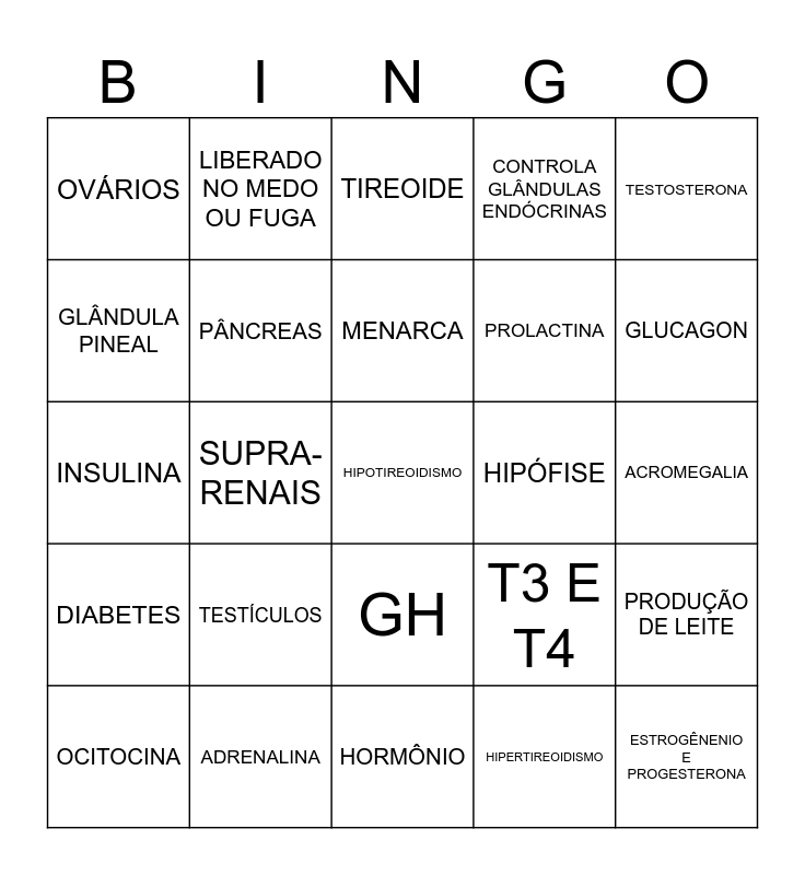 This bingo card has a free space and 29 words: OCITOCINA, GLÂNDULA ENDÓCRINA, SUPRA-RENAIS, HIPOTÁLAMO, OVÁRIOS, TIREOIDE, PÂNCREAS, TESTÍCULOS, HIPÓFISE, ADRENALINA, ACROMEGALIA, ESTROGÊNENIO E PROGESTERONA, HORMÔNIO, HIPERTIREOIDISMO, GLUCAGON, CALCITOCINA, GH, DIABETES, TESTOSTERONA, INSULINA, T3 E T4, MELATONINA, PROLACTINA, GLÂNDULA PINEAL, CONTROLA GLÂNDULAS ENDÓCRINAS, LIBERADO NO MEDO OU FUGA, PRODUÇÃO DE LEITE, MENARCA and SONO.