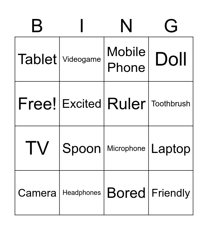 This bingo card has 16 words: Headphones, Laptop, Mobile Phone, Tablet, TV, Videogame, Microphone, Bored, Free!, Excited, Camera, Doll, Spoon, Toothbrush, Ruler and Friendly.