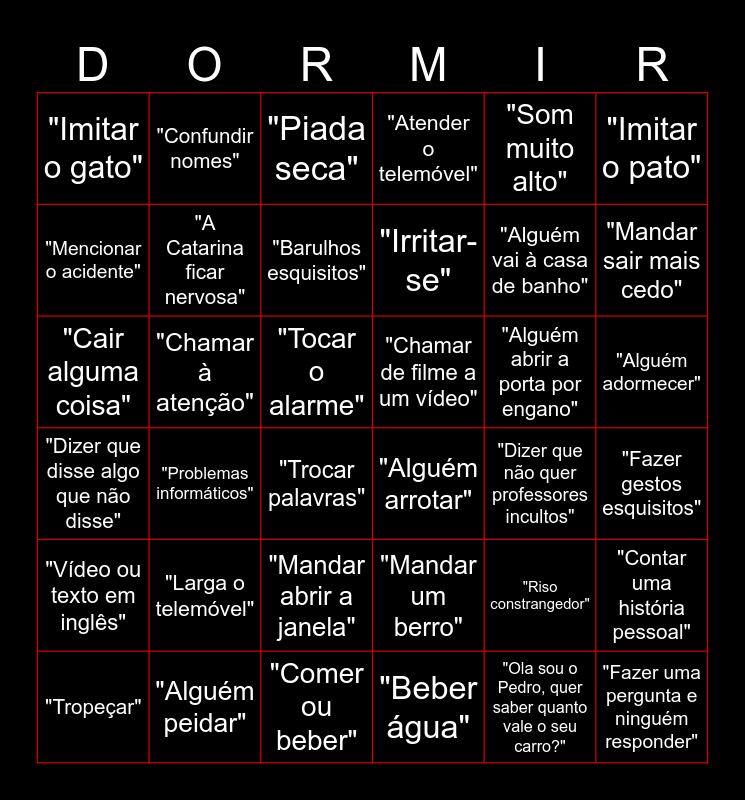 This bingo card has 36 words: "Mandar um berro", "Mandar abrir a janela", "Beber água", "Mencionar o acidente", "Dizer que disse algo que não disse", "Chamar de filme a um vídeo", "A Catarina ficar nervosa", "Comer ou beber", "Som muito alto", "Riso constrangedor", "Mandar sair mais cedo", "Atender o telemóvel", "Contar uma história pessoal", "Chamar à atenção", "Irritar-se", "Imitar o gato", "Vídeo ou texto em inglês", "Alguém abrir a porta por engano", "Cair alguma coisa", "Piada seca", "Tocar o alarme", "Problemas informáticos", "Alguém arrotar", "Trocar palavras", "Dizer que não quer professores incultos", "Confundir nomes", "Alguém vai à casa de banho", "Alguém peidar", "Barulhos esquisitos", "Imitar o pato", "Fazer uma pergunta e ninguém responder", "Tropeçar", "Fazer gestos esquisitos", "Alguém adormecer", "Larga o telemóvel" and "Ola sou o Pedro, quer saber quanto vale o seu carro?".