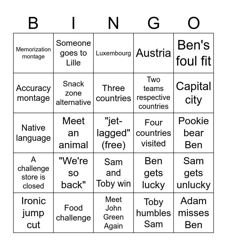 This bingo card has a free space and 24 words: "We're so back", Food challenge, Three countries, Ironic jump cut, Ben's foul fit, Memorization montage, Accuracy montage, Someone goes to Lille, Four countries visited, Sam and Toby win, Two teams respective countries, Native language, Ben gets lucky, Sam gets unlucky, Snack zone alternative, Toby humbles Sam, Pookie bear Ben, Luxembourg, Capital city, Meet an animal, Adam misses Ben, A challenge store is closed, Austria and Meet John Green Again.