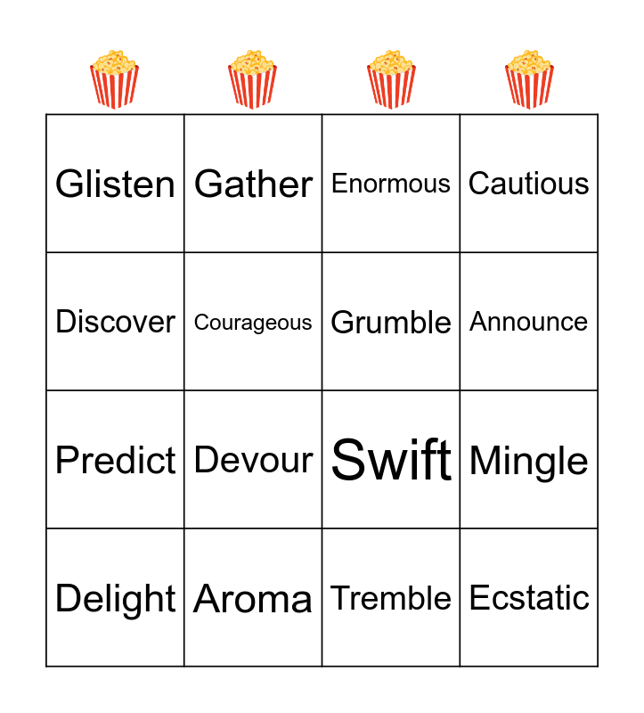 This bingo card has 16 words: Aroma, Mingle, Enormous, Glisten, Predict, Gather, Swift, Tremble, Discover, Courageous, Delight, Cautious, Devour, Announce, Grumble and Ecstatic.