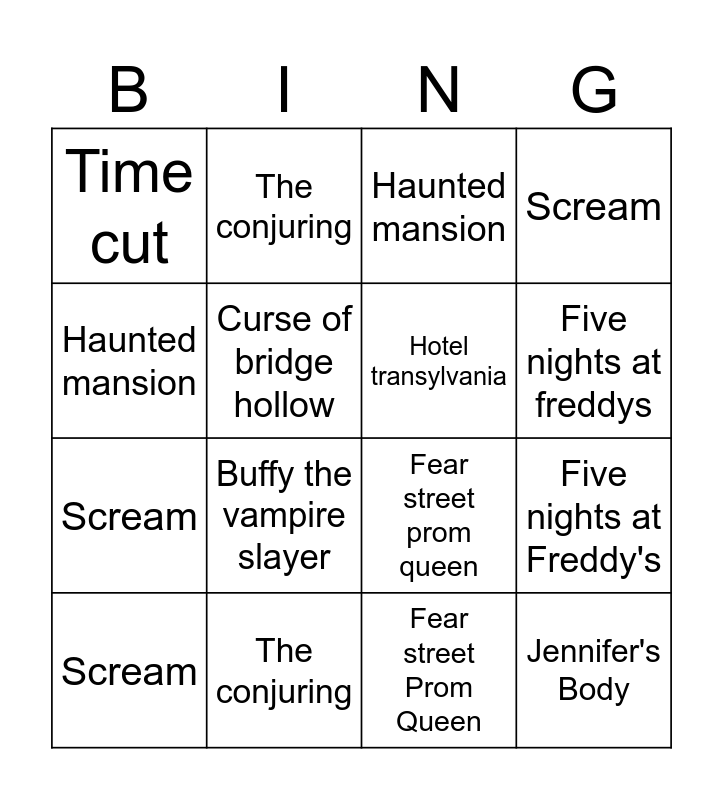 This bingo card has 24 words: Hubie Halloween, Jennifers body, Five nights at freddys, Buffy the vampire slayer, Haunted mansion, Time cut, Curse of bridge hollow, The conjuring, The conjuring, Hocus pocus, Scream, Fear street prom queen, The addams family, Hocus pocus 2, Hotel transylvania, Halloweentown, Fear street Prom Queen, Haunted mansion, Buffy the vampire slayer, Five nights at Freddy's, Scream, Jennifer's Body, Scream and Time Cut.