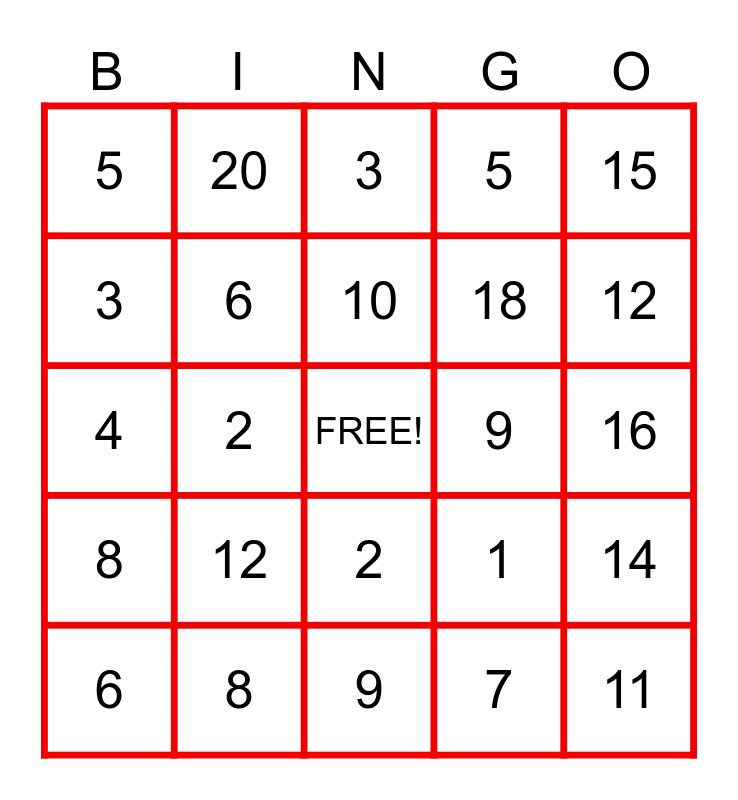 This bingo card has a free space and 24 words: 12, 8, 10, 6, 15, 5, 3, 20, 9, 2, 18, 4, 1, 14, 6, 7, 16, 3, 12, 2, 11, 8, 5 and 9.