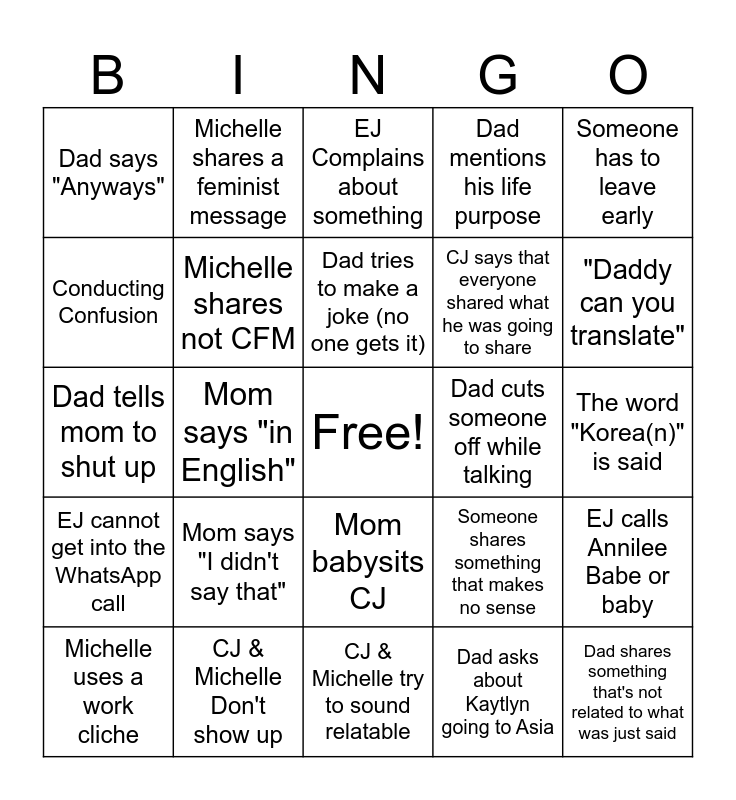 This bingo card has a free space and 24 words: Mom says "I didn't say that", CJ & Michelle Don't show up, Dad tries to make a joke (no one gets it), Michelle uses a work cliche, Someone has to leave early, Dad says "Anyways", Conducting Confusion, Michelle shares a feminist message, Dad cuts someone off while talking, Mom babysits CJ, CJ says that everyone shared what he was going to share, Dad tells mom to shut up, Someone shares something that makes no sense, EJ calls Annilee Babe or baby, Michelle shares not CFM, Dad asks about Kaytlyn going to Asia, The word "Korea(n)" is said, EJ Complains about something, "Daddy can you translate", Mom says "in English", Dad shares something that's not related to what was just said, EJ cannot get into the WhatsApp call, Dad mentions his life purpose and CJ & Michelle try to sound relatable.