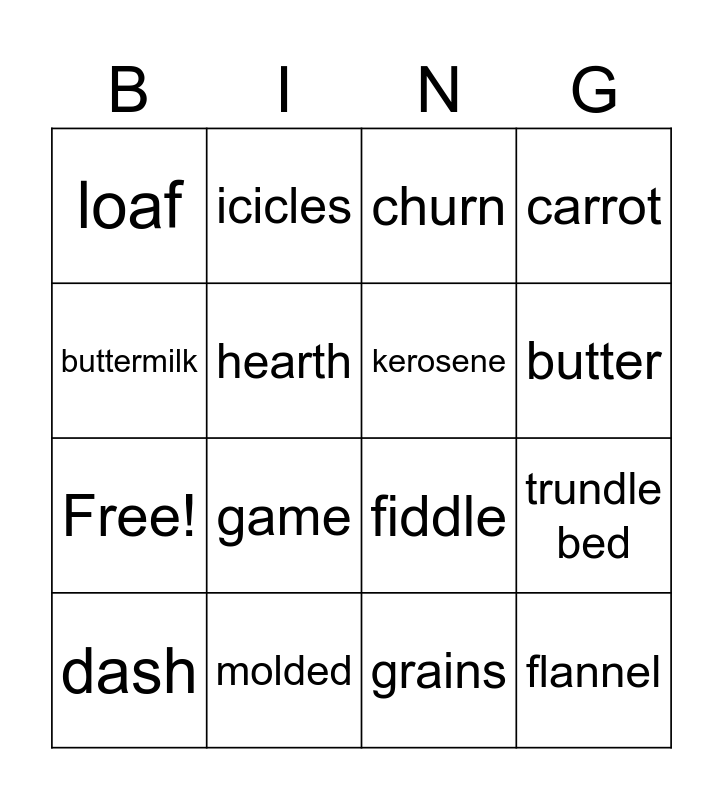 This bingo card has 20 words: trundle bed, mend, churn, scalded, dash, buttermilk, molded, loaf, Free!, icicles, game, fiddle, hearth, flannel, kerosene, panther, butter, carrot, grains and paddle.