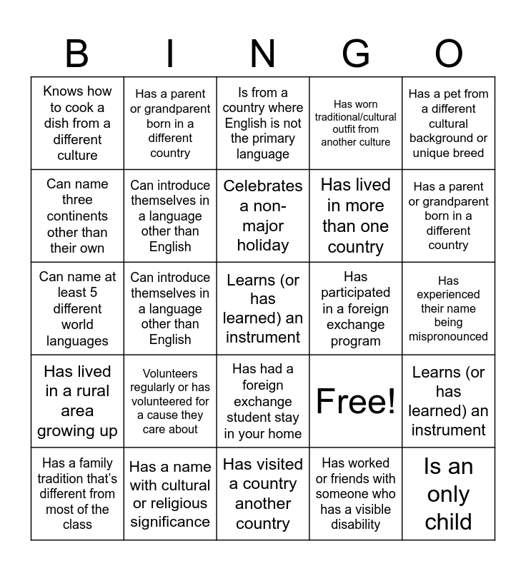 This bingo card has 25 words: Volunteers regularly or has volunteered for a cause they care about, Has visited a country another country, Celebrates a non-major holiday, Has a family tradition that’s different from most of the class, Has a pet from a different cultural background or unique breed, Knows how to cook a dish from a different culture, Can name three continents other than their own, Has a parent or grandparent born in a different country, Has participated in a foreign exchange program, Has had a foreign exchange student stay in your home, Has lived in more than one country, Can name at least 5 different world languages, Free!, Learns (or has learned) an instrument, Can introduce themselves in a language other than English, Is an only child, Has experienced their name being mispronounced, Is from a country where English is not the primary language, Has a parent or grandparent born in a different country, Can introduce themselves in a language other than English, Learns (or has learned) an instrument, Has a name with cultural or religious significance, Has lived in a rural area growing up, Has worn traditional/cultural outfit from another culture and Has worked or friends with someone who has a visible disability.
