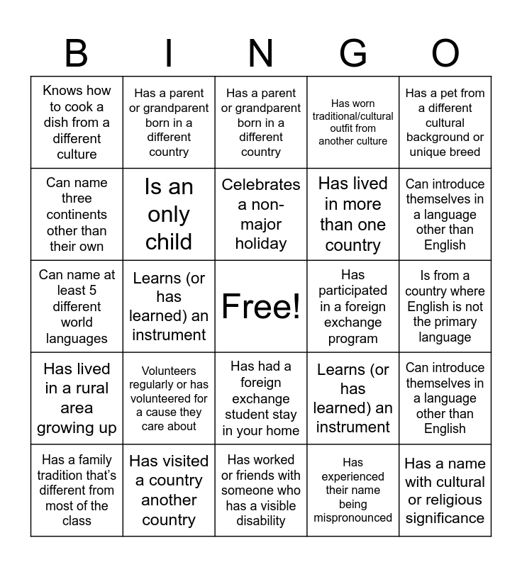 This bingo card has a free space and 24 words: Volunteers regularly or has volunteered for a cause they care about, Has visited a country another country, Celebrates a non-major holiday, Has a family tradition that’s different from most of the class, Has a pet from a different cultural background or unique breed, Knows how to cook a dish from a different culture, Can name three continents other than their own, Has a parent or grandparent born in a different country, Has participated in a foreign exchange program, Has had a foreign exchange student stay in your home, Has lived in more than one country, Can name at least 5 different world languages, Learns (or has learned) an instrument, Can introduce themselves in a language other than English, Is an only child, Has experienced their name being mispronounced, Is from a country where English is not the primary language, Has a parent or grandparent born in a different country, Can introduce themselves in a language other than English, Learns (or has learned) an instrument, Has a name with cultural or religious significance, Has lived in a rural area growing up, Has worn traditional/cultural outfit from another culture and Has worked or friends with someone who has a visible disability.