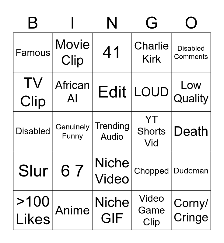 This bingo card has a free space and 24 words: 6 7, Anime, Edit, >100 Likes, Disabled Comments, Famous, TV Clip, Movie Clip, YT Shorts Vid, Niche Video, LOUD, Disabled, Chopped, Dudeman, African AI, Video Game Clip, Death, 41, Low Quality, Genuinely Funny, Corny/ Cringe, Slur, Charlie Kirk and Niche GIF.