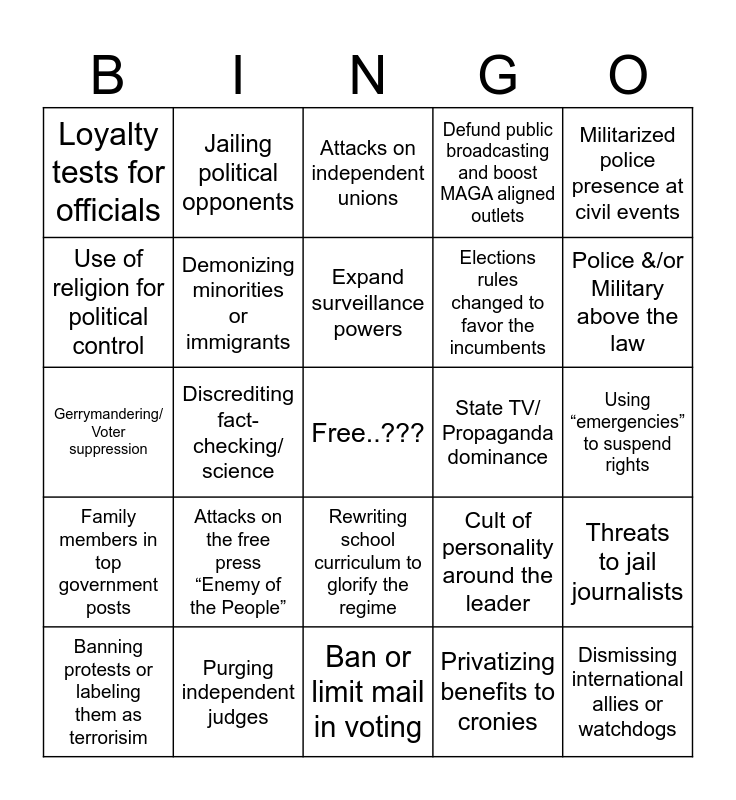 This bingo card has a free space and 24 words: Attacks on the free press “Enemy of the People”, Purging independent judges, Expand surveillance powers, Banning protests or labeling them as terrorisim, Militarized police presence at civil events, Loyalty tests for officials, Use of religion for political control, Jailing political opponents, State TV/ Propaganda dominance, Rewriting school curriculum to glorify the regime, Elections rules changed to favor the incumbents, Gerrymandering/ Voter suppression, Cult of personality around the leader, Threats to jail journalists, Demonizing minorities or immigrants, Privatizing benefits to cronies, Using “emergencies” to suspend rights, Attacks on independent unions, Police &/or Military above the law, Discrediting fact-checking/ science, Dismissing international allies or watchdogs, Family members in top government posts, Defund public broadcasting and boost MAGA aligned outlets and Ban or limit mail in voting.