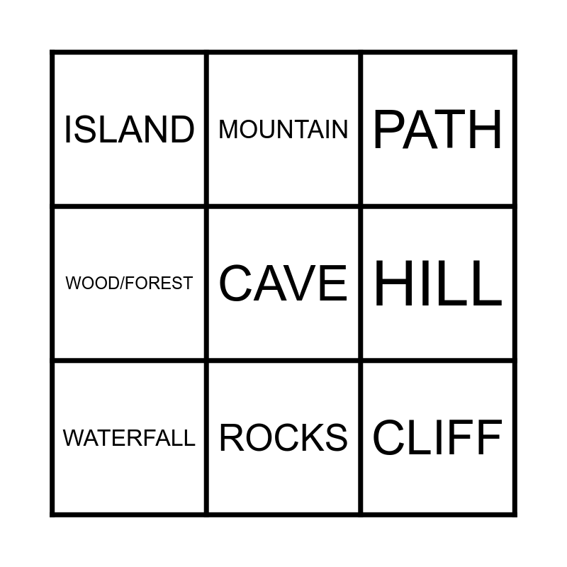 This bingo card has 13 words: Free!, LAKE, WATERFALL, MOUNTAIN, WOOD/FOREST, CAVE, CLIFF, RIVER, ROCKS, ISLAND, HILL, PATH and BEACH.