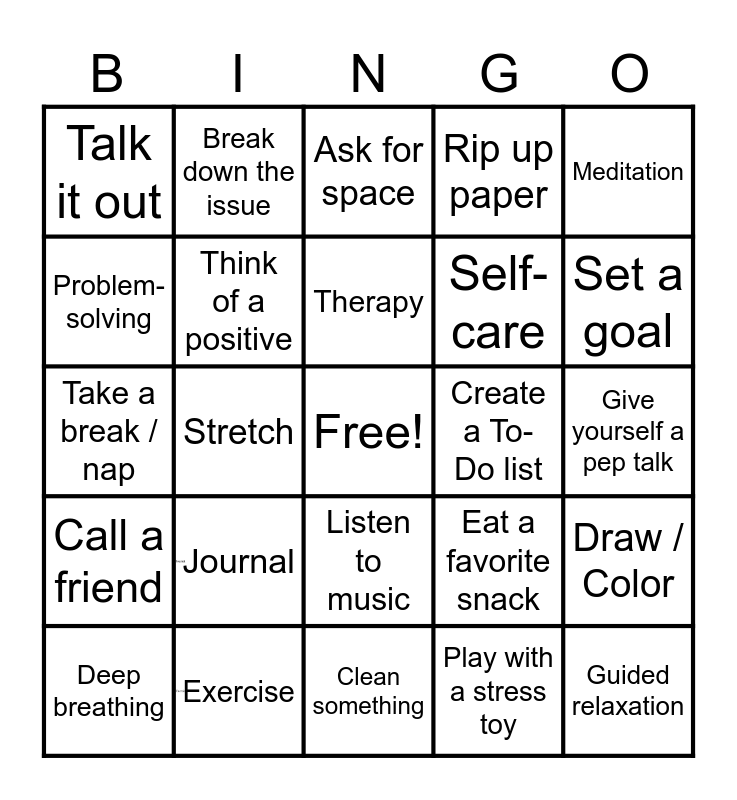 This bingo card has 2 images, a free space and 24 words: Journal, Exercise, Therapy, Deep breathing, Meditation, Talk it out, Problem-solving, Break down the issue, Create a To-Do list, Listen to music, Self-care, Take a break / nap, Eat a favorite snack, Draw / Color, Think of a positive, Play with a stress toy, Give yourself a pep talk, Ask for space, Set a goal, Stretch, Guided relaxation, Call a friend, Rip up paper and Clean something.