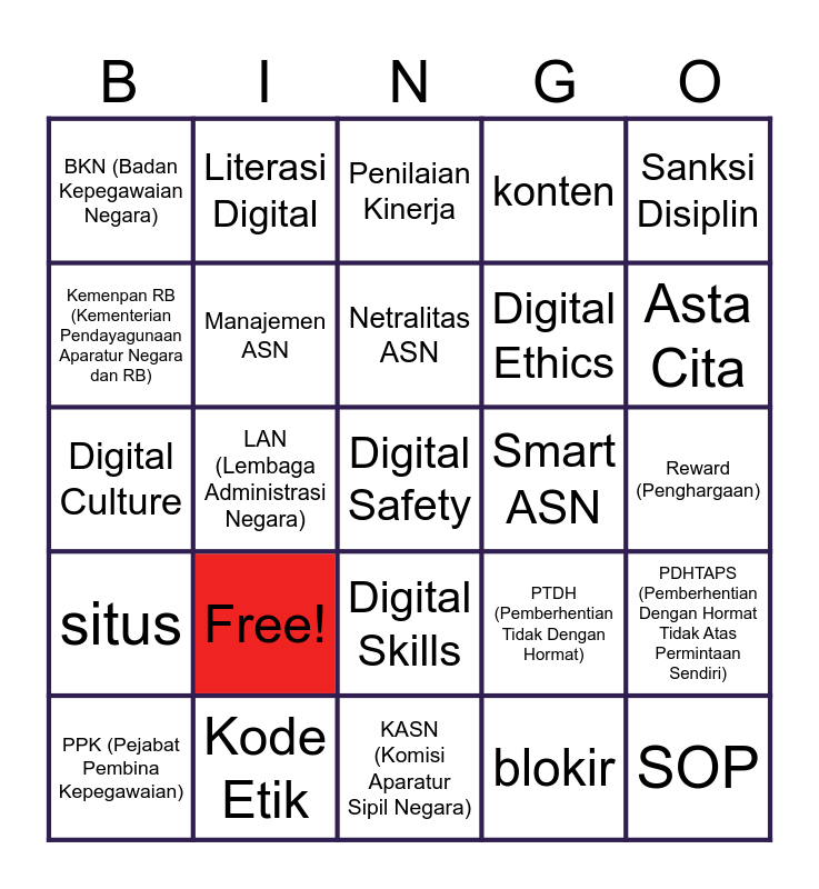 This bingo card has a free space and 25 words: Free!, KASN (Komisi Aparatur Sipil Negara), Netralitas ASN, PPK (Pejabat Pembina Kepegawaian), Sanksi Disiplin, BKN (Badan Kepegawaian Negara), Kemenpan RB (Kementerian Pendayagunaan Aparatur Negara dan RB), Literasi Digital, Smart ASN, Digital Skills, Digital Ethics, Digital Culture, PTDH (Pemberhentian Tidak Dengan Hormat), PDHTAPS (Pemberhentian Dengan Hormat Tidak Atas Permintaan Sendiri), Manajemen ASN, Sistem Merit, Reward (Penghargaan), Penilaian Kinerja, Asta Cita, LAN (Lembaga Administrasi Negara), SOP, Kode Etik, situs, konten and blokir.