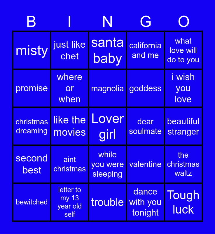 This bingo card has a free space and 54 words: dreamer, second best, haunted, Mr. Eclectic, while you were sleeping, Carousel, california and me, Falling behind, promise, from the start, misty, serendipity, letter to my 13 year old self, bewitched, bored, trouble, Tough luck, goddess, fragile, beautiful stranger, valentine, above the chinese restaurant, dear soulmate, what love will do to you, ive never been in love before, just like chet, everything i know about love, falling behind, hi, dance with you tonight, night light, slow down, lucky for me, questions for the universe, santa baby, winter wonderland, christmas dreaming, the christmas waltz, love to keep me warm, where or when, bewitched - rework, have yourself a merry little christmas, better than snow, a night to remember, aint christmas, love flew away, let you break my heart again, street by street, magnolia, like the movies, i wish you love, james, someone new and best friend.