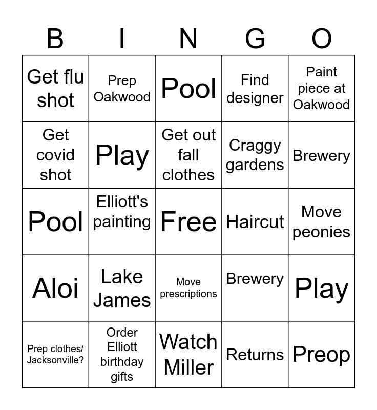 This bingo card has a free space and 24 words: Lake James, Order Elliott birthday gifts, Get out fall clothes, Prep clothes/ Jacksonville?, Paint piece at Oakwood, Get flu shot, Get covid shot, Prep Oakwood, Haircut, Move prescriptions, Craggy gardens, Pool, Brewery, Play, Play, Returns, Move peonies, Pool, Brewery, Elliott's painting, Preop, Aloi, Find designer and Watch Miller.