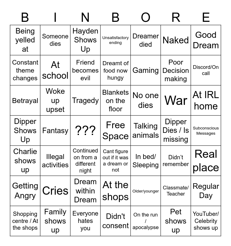 This bingo card has a free space and 52 words: Family shows up, Poor Decision making, Apartment, Fantasy, Tragedy, Didn’t remember, Someone dies, Pet shows up, Naked, Real place, Good Dream, Cant figure out if it was a dream or not, War, No one dies, Older/younger, Continued on from a different night, Constant theme changes, Discord/On call, Everyone hates you, Dreamer died, Gaming, ???, Being yelled at, At school, Didn't consent, YouTuber/ Celebrity shows up, Subconscious Messages, On the run / apocalypse, Friend becomes evil, Dipper Dies / Is missing, Instant Karma, Unsatisfactory ending, At the shops, Classmate/ Teacher, Charlie shows up, Hayden Shows Up, Dipper Shows Up, In bed/ Sleeping, Getting Angry, Cries, Dream within Dream, Betrayal, Woke up upset, Woke up a lot during the night, Blankets on the floor, Talking animals, Illegal activities, Dreamt of food now hungy, Regular Day, Shopping centre / At the shops, At IRL home and At home (But that's not your house).