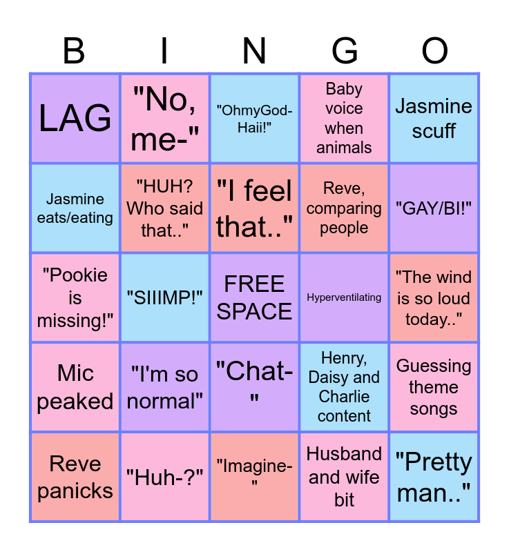 This bingo card has a free space and 24 words: Reve panicks, "I'm so normal", "I feel that..", Husband and wife bit, Jasmine scuff, LAG, "No, me-", "OhmyGod-Haii!", Hyperventilating, "The wind is so loud today..", "Pookie is missing!", "HUH? Who said that..", Henry, Daisy and Charlie content, Guessing theme songs, Jasmine eats/eating, "Huh-?", "Imagine-", Baby voice when animals, "GAY/BI!", Mic peaked, "SIIIMP!", "Chat-", Reve, comparing people and "Pretty man..".