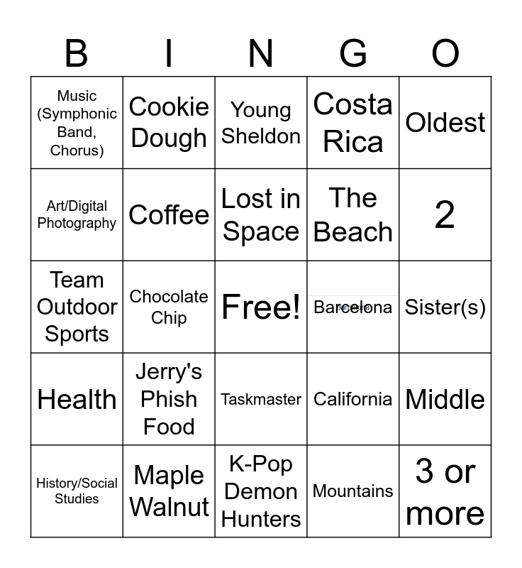 This bingo card has 1 images, a free space and 77 words: English, Mint/Mint Chip/Mint Oreo, Young Sheldon, India, 0, Geometry, Strawberry/ Strawberry Cheesecake, Good Omens, New York, 1, History/Social Studies, Chocolate, Barcelona, 2, Science, Coffee, Breaking Bad, California, 3 or more, Art/Digital Photography, Cookies & Cream, Lost in Space, The Beach, Oldest, Music (Symphonic Band, Chorus), Vanilla, Wednesday, Cape Cod, Youngest, Cooking, Maple Walnut, Avatar, Aruba, Middle, Team Outdoor Sports, Cookie Dough, Henry Danger, Florida, Sister(s), Health, Mocha Chip, Ducktales, Portugal, Brother(s), Business Concepts, Jerry's Phish Food, Modern Family, Costa Rica, Pineapple Sorbet, Love Island, Prince Edward Island, Chocolate Chip, Victorious, London, Brownie, The Rookie, Maine, Don't like ice cream, The West Wing, Bahamas, Taskmaster, Ohio, Criminal Minds, Spain, Bloodline, Netherlands, Shameless, Mountains, Motherland Fort Salem, Turkey, Everyone Hates Chris, Battle for Dream Island, K-Pop Demon Hunters, The Summer I turned Pretty, Survivor, Friends and None/No TV.