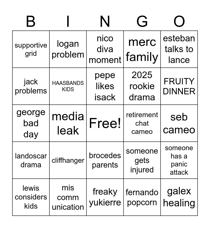 This bingo card has a free space and 24 words: cliffhanger, mis comm unication, pepe likes isack, lewis considers kids, esteban talks to lance, supportive grid, jack problems, logan problem, retirement chat cameo, brocedes parents, 2025 rookie drama, george bad day, someone gets injured, someone has a panic attack, HAASBANDS KIDS, fernando popcorn, seb cameo, nico diva moment, FRUITY DINNER, media leak, galex healing, landoscar drama, merc family and freaky yukierre.