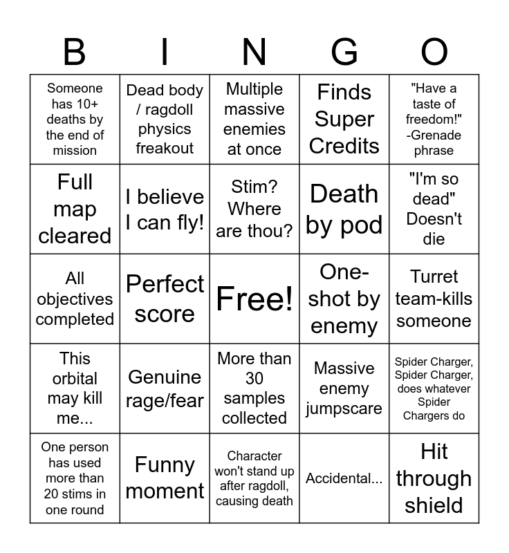 This bingo card has a free space and 24 words: Genuine rage/fear, Funny moment, Stim? Where are thou?, One person has used more than 20 stims in one round, "Have a taste of freedom!" -Grenade phrase, Someone has 10+ deaths by the end of mission, Full map cleared, Dead body / ragdoll physics freakout, One-shot by enemy, More than 30 samples collected, Death by pod, All objectives completed, Massive enemy jumpscare, Spider Charger, Spider Charger, does whatever Spider Chargers do, I believe I can fly!, Accidental..., Turret team-kills someone, Multiple massive enemies at once, "I'm so dead" Doesn't die, Perfect score, Hit through shield, This orbital may kill me..., Finds Super Credits and Character won't stand up after ragdoll, causing death.