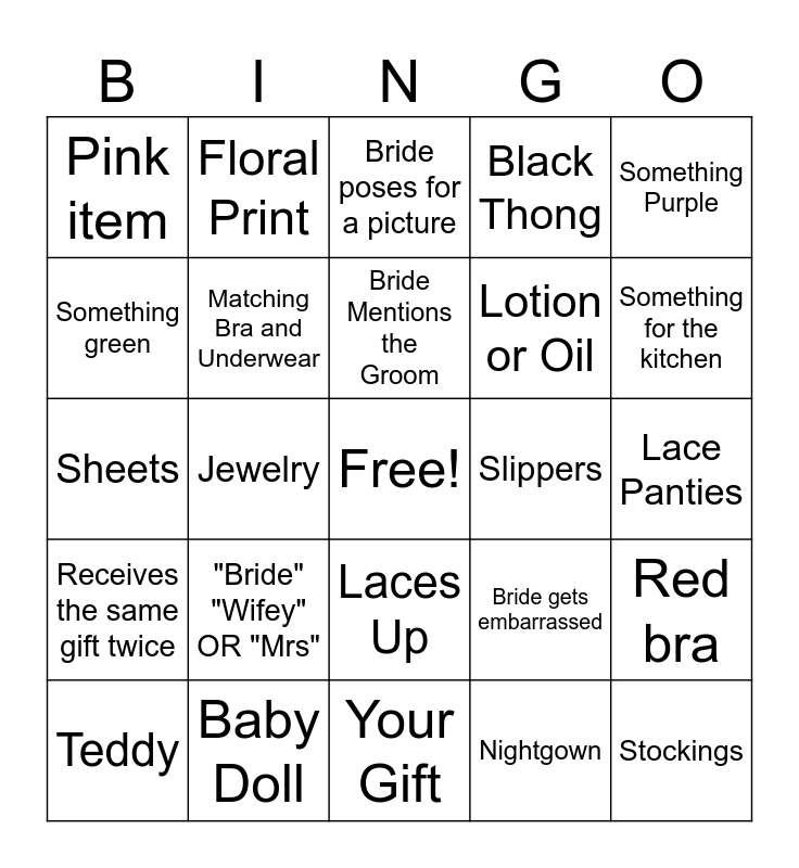 This bingo card has a free space and 39 words: Something White, Push Up Bra, Animal Print, Matching Bra and Underwear, Teddy, Laces Up, Bride Mentions the Groom, Pajama Set, Something Purple, Receives the same gift twice, Jewelry, Black Thong, Stockings, Lace Panties, Slippers, "Bride" "Wifey" OR "Mrs", Bride mentions the honeymoon, Pink item, A book, Bride gets embarrassed, Something green, Your Gift, Lotion or Oil, Something for the kitchen, Sheer item, Something unexpected, A gift card, Silk Robe, A candle, Floral Print, Stripes, Something Sparkly, Bride poses for a picture, Baby Doll, Nightgown, Socks, Red bra, Sheets and Flannel.