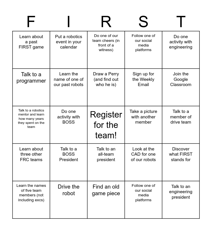 This bingo card has a free space and 24 words: Talk to a BOSS President, Drive the robot, Draw a Perry (and find out who he is), Learn the names of five team members (not including excs), Do one activity with engineering, Learn about a past FIRST game, Talk to a programmer, Put a robotics event in your calendar, Take a picture with another member, Talk to an all-team president, Sign up for the Weekly Email, Talk to a robotics mentor and learn how many years they spent on the team, Look at the CAD for one of our robots, Discover what FIRST stands for, Learn the name of one of our past robots, Follow one of our social media platforms, Talk to a member of drive team, Do one of our team cheers (in front of a witness), Join the Google Classroom, Do one activity with BOSS, Talk to an engineering president, Learn about three other FRC teams, Follow one of our social media platforms and Find an old game piece.