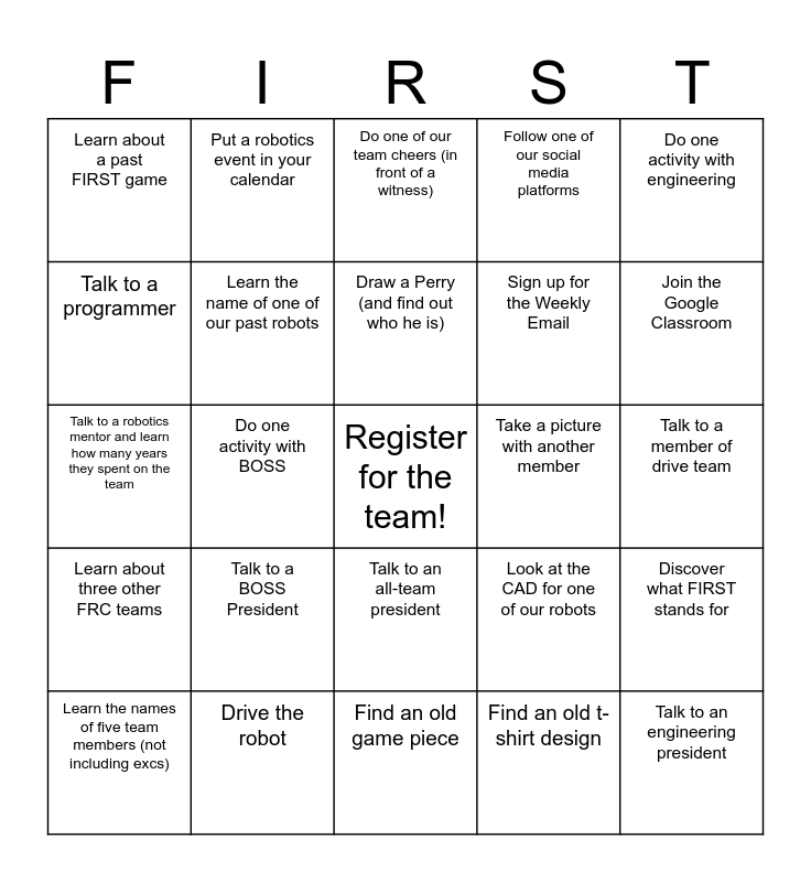 This bingo card has a free space and 24 words: Talk to a BOSS President, Drive the robot, Draw a Perry (and find out who he is), Learn the names of five team members (not including excs), Do one activity with engineering, Learn about a past FIRST game, Talk to a programmer, Put a robotics event in your calendar, Take a picture with another member, Talk to an all-team president, Sign up for the Weekly Email, Talk to a robotics mentor and learn how many years they spent on the team, Look at the CAD for one of our robots, Discover what FIRST stands for, Learn the name of one of our past robots, Find an old t-shirt design, Talk to a member of drive team, Do one of our team cheers (in front of a witness), Join the Google Classroom, Do one activity with BOSS, Talk to an engineering president, Learn about three other FRC teams, Follow one of our social media platforms and Find an old game piece.