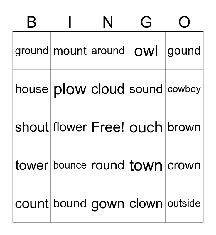 This bingo card has a free space and 24 words: bounce, bound, cloud, count, gound, ground, house, mount, ouch, round, sound, shout, town, crown, plow, clown, brown, around, cowboy, flower, outside, tower, owl and gown.