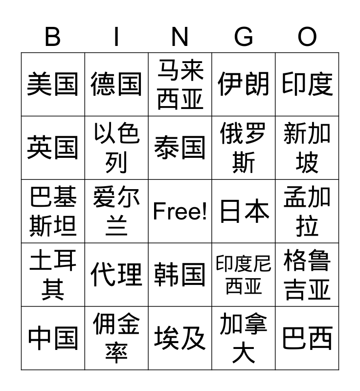This bingo card has a free space and 24 words: 代理, 佣金率, 泰国, 中国, 印度, 美国, 英国, 德国, 日本, 韩国, 俄罗斯, 巴基斯坦, 印度尼西亚, 格鲁吉亚, 以色列, 加拿大, 孟加拉, 马来西亚, 新加坡, 爱尔兰, 巴西, 土耳其, 伊朗 and 埃及.