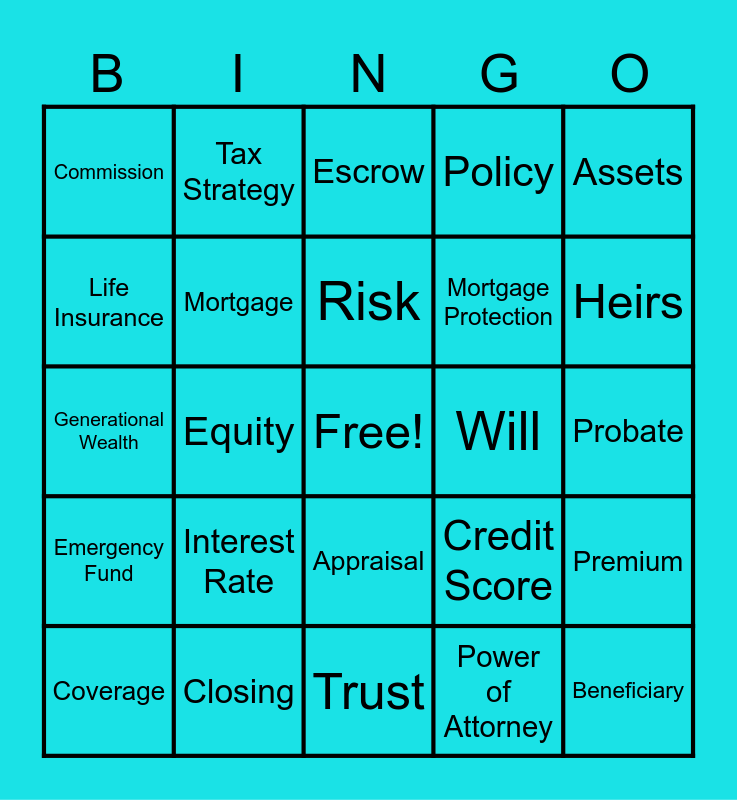 This bingo card has a free space and 30 words: Closing, Title, Equity, First-time buyer, Commission, Escrow, Mortgage, Appraisal, Will, Trust, Probate, Beneficiary, Power of Attorney, Legacy, Heirs, Budget, Credit Score, Emergency Fund, Interest Rate, Assets, Generational Wealth, Retirement, Tax Strategy, Mortgage Protection, Life Insurance, Policy, Premium, Coverage, Risk and Safety Net.