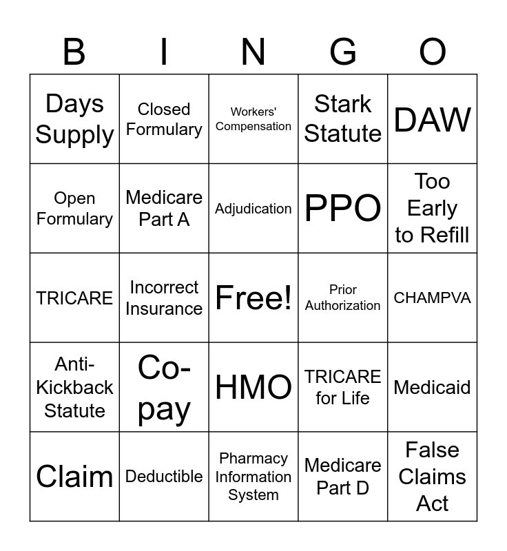 This bingo card has a free space and 24 words: Co-pay, Deductible, Adjudication, Claim, DAW, Days Supply, Open Formulary, Closed Formulary, Prior Authorization, HMO, PPO, TRICARE, TRICARE for Life, Medicaid, Medicare Part A, Medicare Part D, CHAMPVA, Workers' Compensation, Too Early to Refill, Incorrect Insurance, False Claims Act, Anti-Kickback Statute, Stark Statute and Pharmacy Information System.