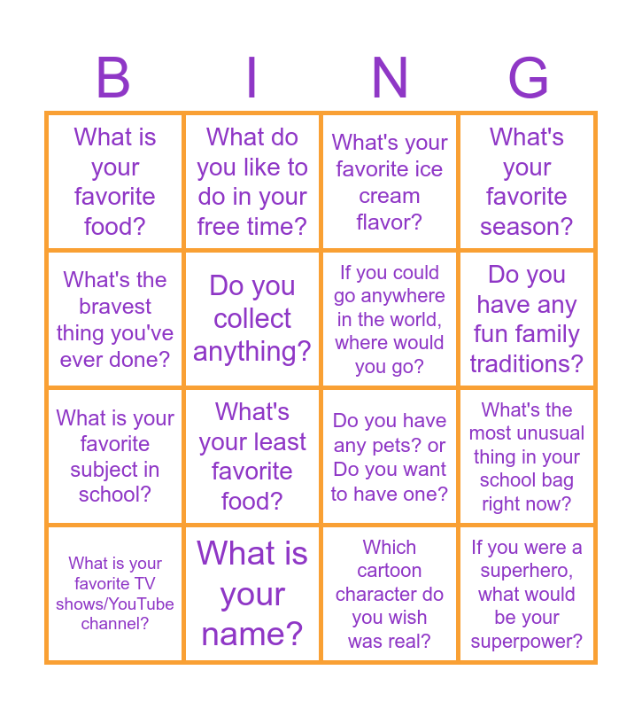 This bingo card has 16 words: What is your name?, What's the most unusual thing in your school bag right now?, What's your favorite ice cream flavor?, What is your favorite food?, What is your favorite subject in school?, What do you like to do in your free time?, Do you have any pets? or Do you want to have one?, Which cartoon character do you wish was real?, What's the bravest thing you've ever done?, Do you collect anything?, What is your favorite TV shows/YouTube channel?, What's your favorite season?, What's your least favorite food?, Do you have any fun family traditions?, If you could go anywhere in the world, where would you go? and If you were a superhero, what would be your superpower?.