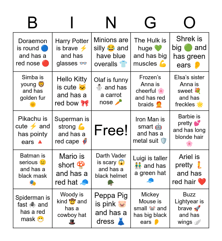 This bingo card has a free space and 32 words: Mickey Mouse is small π and has big black ears π, Elsa is beautiful βοΈ and has long blonde hair π, Superman is strong πͺ and has a red cape π¦Έ, Dora is curious π§ and has short brown hair π€, Batman is serious π and has a black mask π, Hello Kitty is cute π± and has a red bow π, Shrek is big π’ and has green ears π, Ariel is pretty π§ and has red hair β€οΈ, Harry Potter is brave β‘ and has glasses π, Santa Claus is jolly π and has a white beard π§, Olaf is funny β and has a carrot nose π₯, Minions are silly π and have blue overalls π, Winnie the Pooh is chubby π» and has a red shirt π, Cinderella is kind πΈ and has glass shoes π , Iron Man is smart π€ and has a metal suit π‘οΈ, Rapunzel is tall π° and has very long hair π», Spiderman is fast π·οΈ and has a red mask π·, Pikachu is cute β‘ and has pointy ears πΊ, Darth Vader is scary π± and has a black helmet πͺ, Mario is short π and has a red hat π§’, Luigi is taller π¬ and has a green hat π§’, Snoopy is friendly πΆ and has floppy ears π, Barbie is pretty π and has long blonde hair πΈ, Woody is kind π€ and has a cowboy hat π©, Buzz Lightyear is brave π and has wings πͺ½, The Hulk is huge π and has big muscles πͺ, Frozenβs Anna is cheerful πΈ and has red braids π§βπ¦°, Simba is young π¦ and has golden fur π, Doraemon is round π΅ and has a red nose π΄, Peppa Pig is pink π· and has a dress π, Sailor Moon is magical π and has long pigtails π and Elsaβs sister Anna is sweet π and has freckles π.