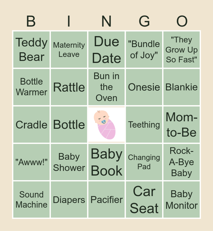 This bingo card has a free space and 30 words: Diapers, Bouncer, Bottle, Bib, Teddy Bear, Due Date, Rattle, Baby Book, Teething, Pacifier, Mom-to-Be, Baby Monitor, Car Seat, Stroller, Blankie, High Chair, Changing Pad, "Awww!", Baby Shower, "They Grow Up So Fast", Cradle, Baby Wipes, Maternity Leave, Onesie, Bottle Warmer, "Bundle of Joy", Rock-A-Bye Baby, Sound Machine, Bun in the Oven and Gender Reveal.