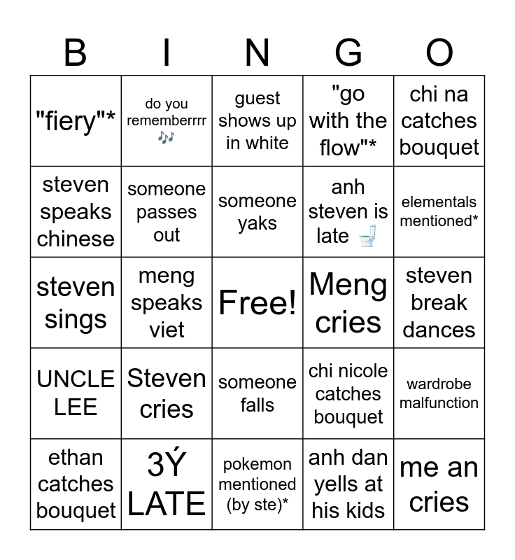 This bingo card has a free space and 24 words: Steven cries, 3Ý LATE, someone yaks, ethan catches bouquet, chi na catches bouquet, "fiery"*, steven speaks chinese, do you rememberrrr 🎶, Meng cries, someone falls, anh steven is late 🚽, steven sings, chi nicole catches bouquet, wardrobe malfunction, someone passes out, anh dan yells at his kids, steven break dances, guest shows up in white, elementals mentioned*, meng speaks viet, me an cries, UNCLE LEE, "go with the flow"* and pokemon mentioned (by ste)*.