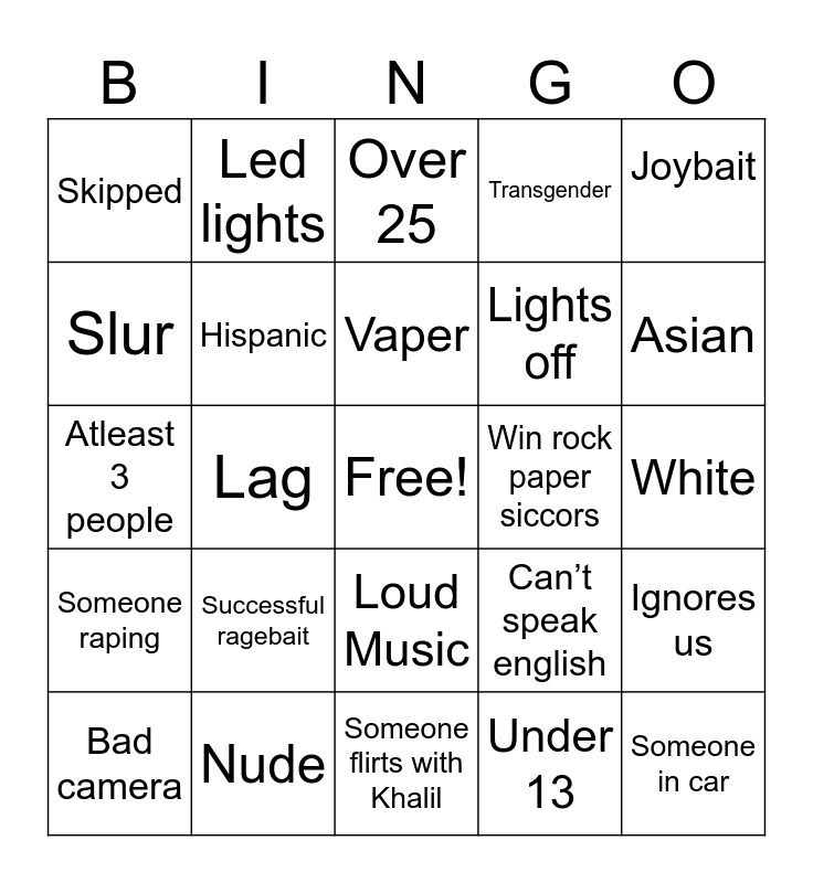 This bingo card has a free space and 24 words: Successful ragebait, Nude, Vaper, Bad camera, Joybait, Skipped, Slur, Led lights, Win rock paper siccors, Loud Music, Lights off, Atleast 3 people, Can’t speak english, Ignores us, Hispanic, Under 13, White, Over 25, Asian, Lag, Someone in car, Someone raping, Transgender and Someone flirts with Khalil.