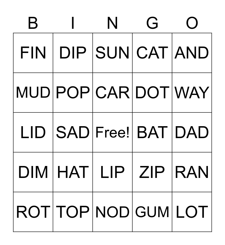 This bingo card has a free space and 24 words: HAT, TOP, CAR, ROT, AND, FIN, MUD, DIP, BAT, LIP, DOT, LID, ZIP, RAN, POP, GUM, DAD, SUN, WAY, SAD, LOT, DIM, CAT and NOD.