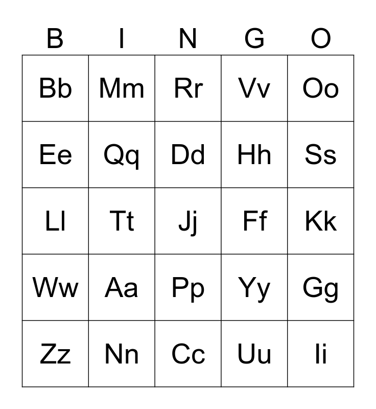 This bingo card has 25 words: Aa, Cc, Dd, Zz, Oo, Bb, Ee, Mm, Ff, Pp, Hh, Ll, Yy, Gg, Qq, Ii, Kk, Rr, Ss, Tt, Jj, Nn, Ww, Vv and Uu.