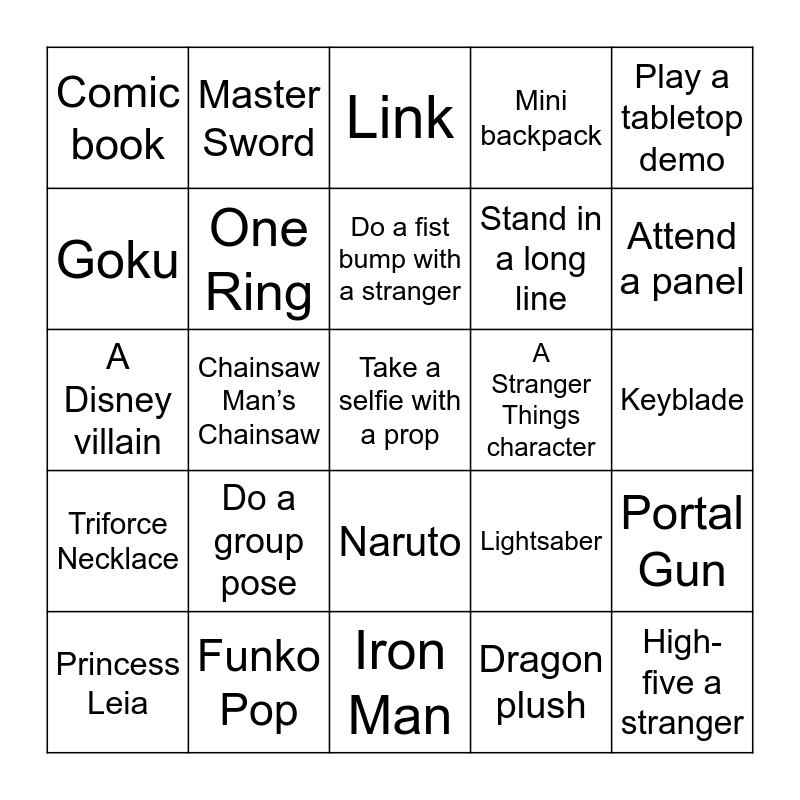This bingo card has 29 words: Princess Leia, Miles Morales, Chainsaw Man’s Chainsaw, High-five a stranger, Comic book, Link, One Ring, Do a group pose, A Stranger Things character, Funko Pop, Keyblade, Take a selfie with a prop, Iron Man, Dragon plush, Attend a panel, Batarang, Naruto, Triforce Necklace, Play a tabletop demo, A Disney villain, Lightsaber, Rivers of Blood katana, Stand in a long line, Goku, Mini backpack, Master Sword, Portal Gun, Do a fist bump with a stranger and Food or drink spilled on the floor.