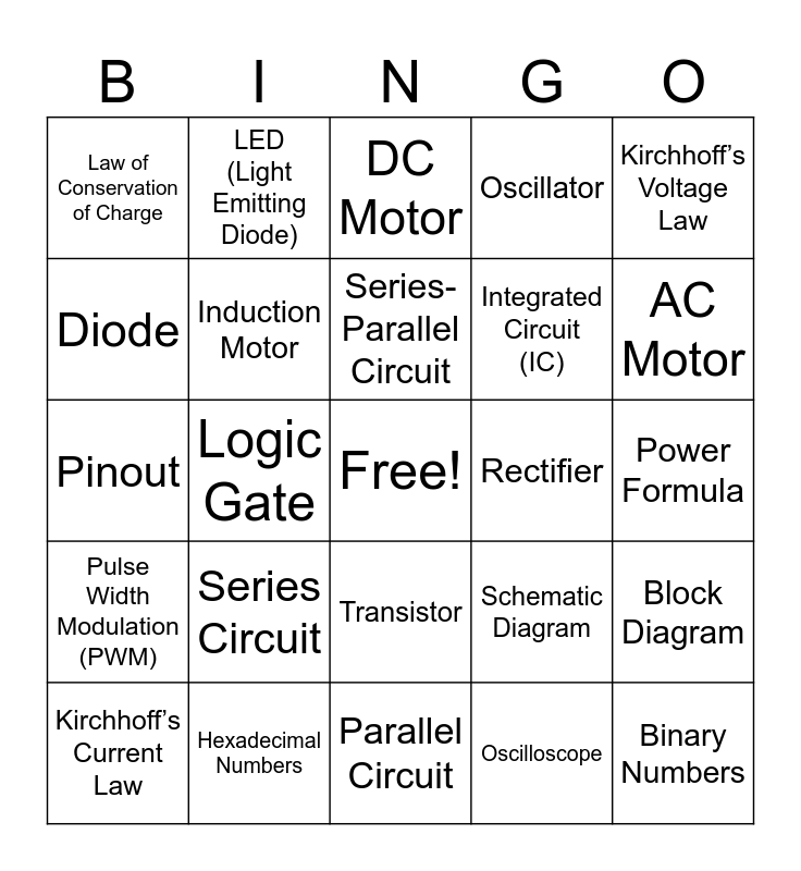 This bingo card has a free space and 25 words: Series Circuit, Parallel Circuit, Series-Parallel Circuit, Kirchhoff’s Current Law, Kirchhoff’s Voltage Law, Law of Conservation of Charge, Diode, LED (Light Emitting Diode), Rectifier, Transistor, Integrated Circuit (IC), Pinout, Schematic Diagram, Block Diagram, Induction Motor, Torque, Power Formula, DC Motor, AC Motor, Logic Gate, Binary Numbers, Hexadecimal Numbers, Pulse Width Modulation (PWM), Oscillator and Oscilloscope.