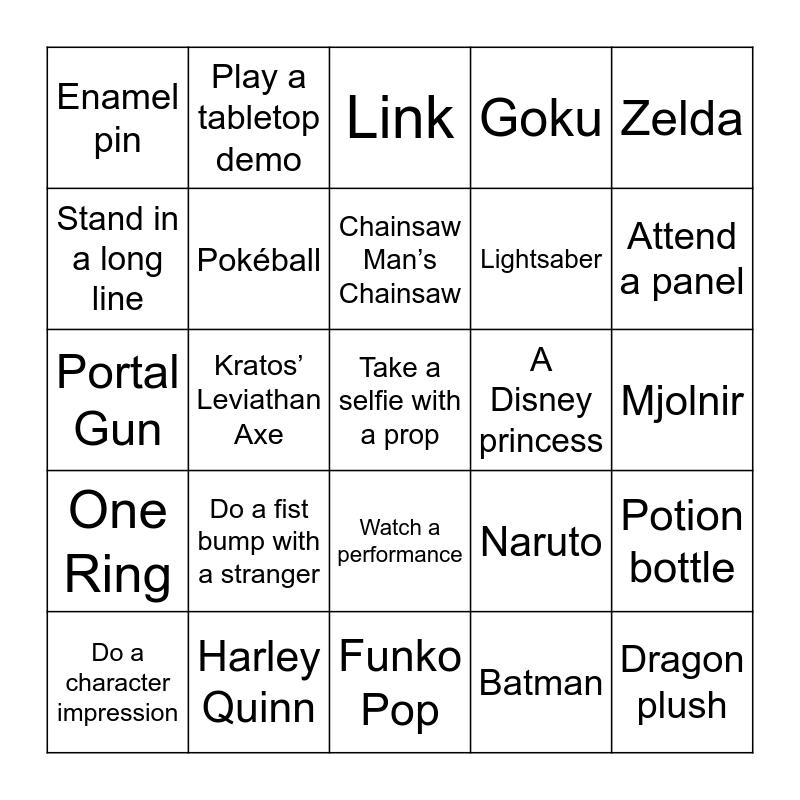 This bingo card has 30 words: Harley Quinn, Deadpool, Kratos’ Leviathan Axe, High-five a stranger, Enamel pin, Link, Pokéball, Watch a performance, A Disney princess, Funko Pop, Mjolnir, Take a selfie with a prop, Batman, Dragon plush, Attend a panel, Replica helmet, Naruto, One Ring, Do a fist bump with a stranger, Zelda, Portal Gun, Mini backpack, Play a tabletop demo, Lightsaber, Stand in a long line, Goku, Potion bottle, Do a character impression, Chainsaw Man’s Chainsaw and A Star Wars character.