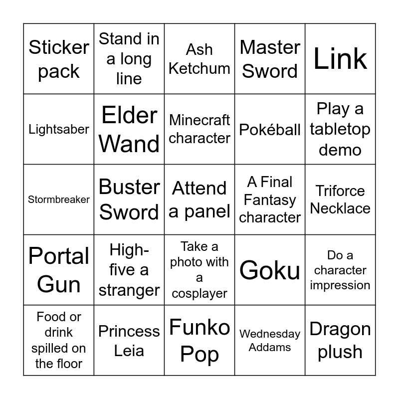 This bingo card has 30 words: Princess Leia, Miles Morales, Buster Sword, Do a group pose, Sticker pack, Ash Ketchum, Elder Wand, Take a photo with a cosplayer, A Final Fantasy character, Funko Pop, Triforce Necklace, Attend a panel, Wednesday Addams, Dragon plush, Play a tabletop demo, Batarang, Goku, Portal Gun, High-five a stranger, Link, Stormbreaker, Mini backpack, Stand in a long line, Pokéball, Lightsaber, Master Sword, Do a character impression, Food or drink spilled on the floor, Minecraft character and Chainsaw Man’s Chainsaw.