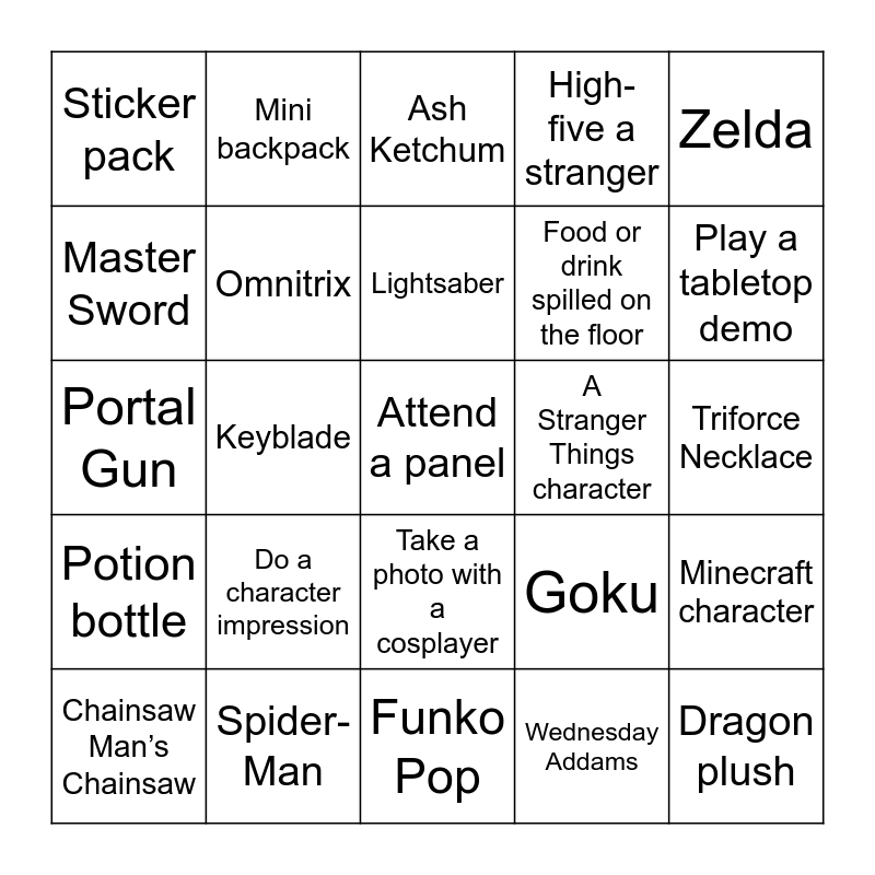 This bingo card has 30 words: Spider-Man, Harley Quinn, Keyblade, Do a group pose, Sticker pack, Ash Ketchum, Omnitrix, Take a photo with a cosplayer, A Stranger Things character, Funko Pop, Triforce Necklace, Attend a panel, Wednesday Addams, Dragon plush, Play a tabletop demo, Batarang, Goku, Potion bottle, Do a character impression, Zelda, Portal Gun, Stand in a long line, Mini backpack, Food or drink spilled on the floor, Master Sword, High-five a stranger, Minecraft character, Chainsaw Man’s Chainsaw, Lightsaber and A Final Fantasy character.