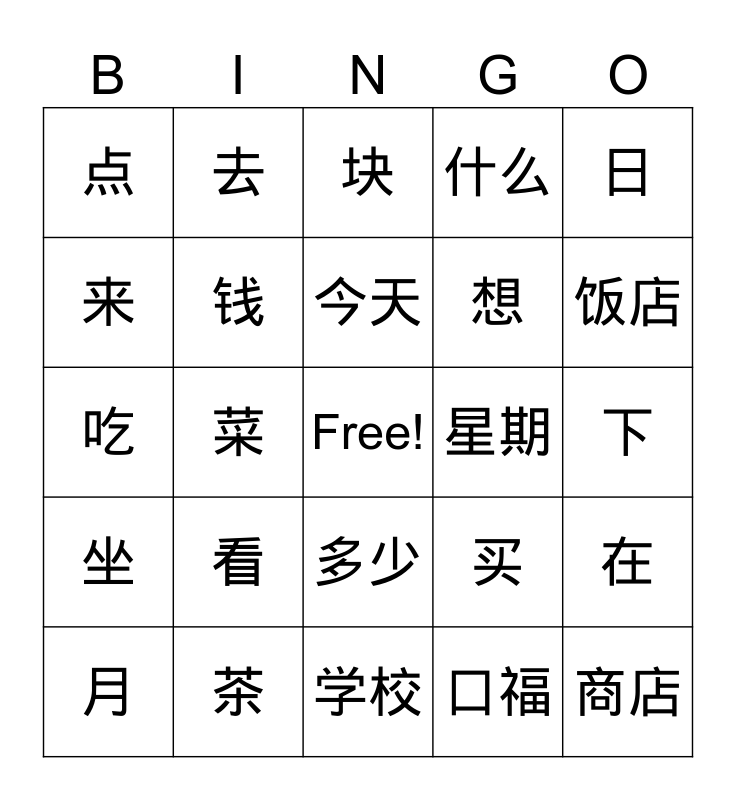 This bingo card has a free space and 25 words: 看, 学校, 今天, 月, 日, 点, 来, 去, 星期, 多少, 想, 吃, 买, 在, 钱, 上, 下, 块, 饭店, 菜, 商店, 茶, 坐, 什么 and 口福.