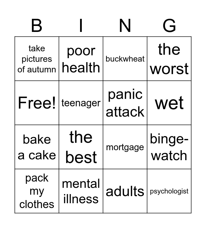 This bingo card has 16 words: mental illness, binge-watch, buckwheat, take pictures of autumn, bake a cake, poor health, mortgage, adults, Free!, teenager, pack my clothes, the worst, the best, wet, panic attack and psychologist.