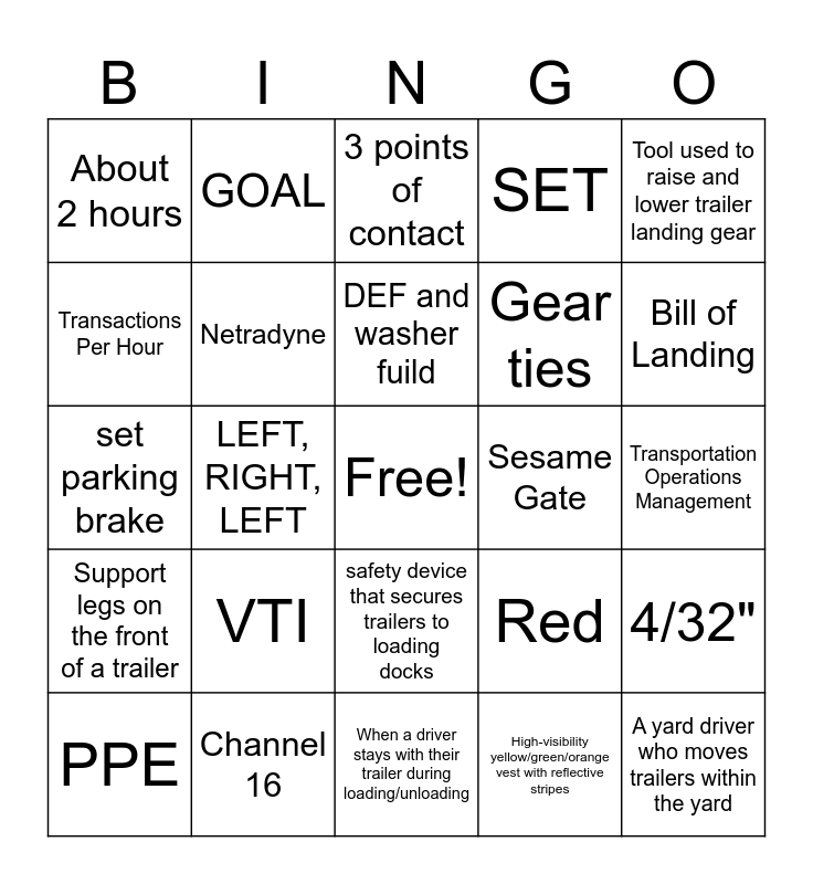 This bingo card has a free space and 29 words: PPE, 30, LEFT, RIGHT, LEFT, Kepler, About 2 hours, 3 points of contact, Netradyne, VTI, Sesame Gate, Channel 16, Transportation Operations Management, A yard driver who moves trailers within the yard, When a driver stays with their trailer during loading/unloading, High-visibility yellow/green/orange vest with reflective stripes, Bill of Landing, Physical inventory check of all trailers and their locations in the yard, safety device that secures trailers to loading docks, Support legs on the front of a trailer, Tool used to raise and lower trailer landing gear, set parking brake, Red, Safety device used to help open/close trailer doors, Gear ties, Transactions Per Hour, SET, GOAL, 4/32", DEF and washer fuild and 30 mins.