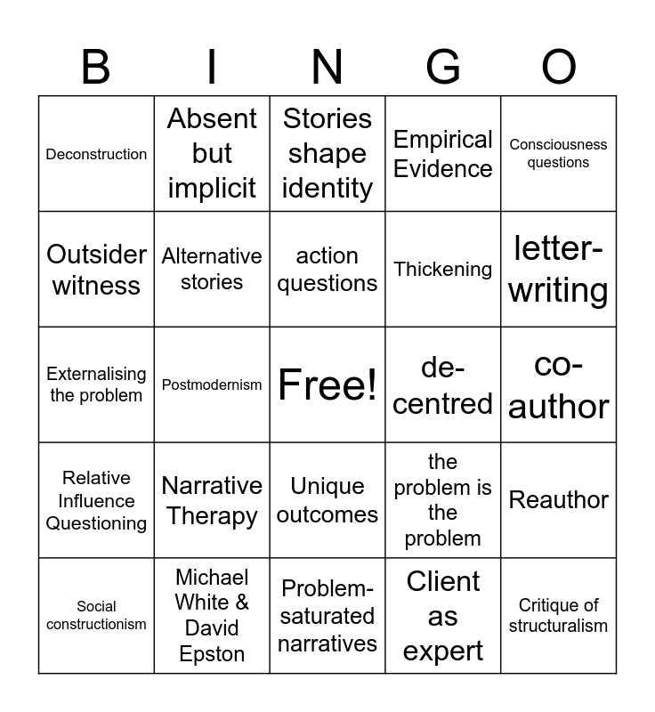 This bingo card has a free space and 24 words: Narrative Therapy, Michael White & David Epston, action questions, Social constructionism, Consciousness questions, Deconstruction, Outsider witness, Absent but implicit, de-centred, Unique outcomes, Thickening, Externalising the problem, the problem is the problem, Reauthor, Alternative stories, Client as expert, co-author, Stories shape identity, letter-writing, Postmodernism, Critique of structuralism, Relative Influence Questioning, Empirical Evidence and Problem-saturated narratives.