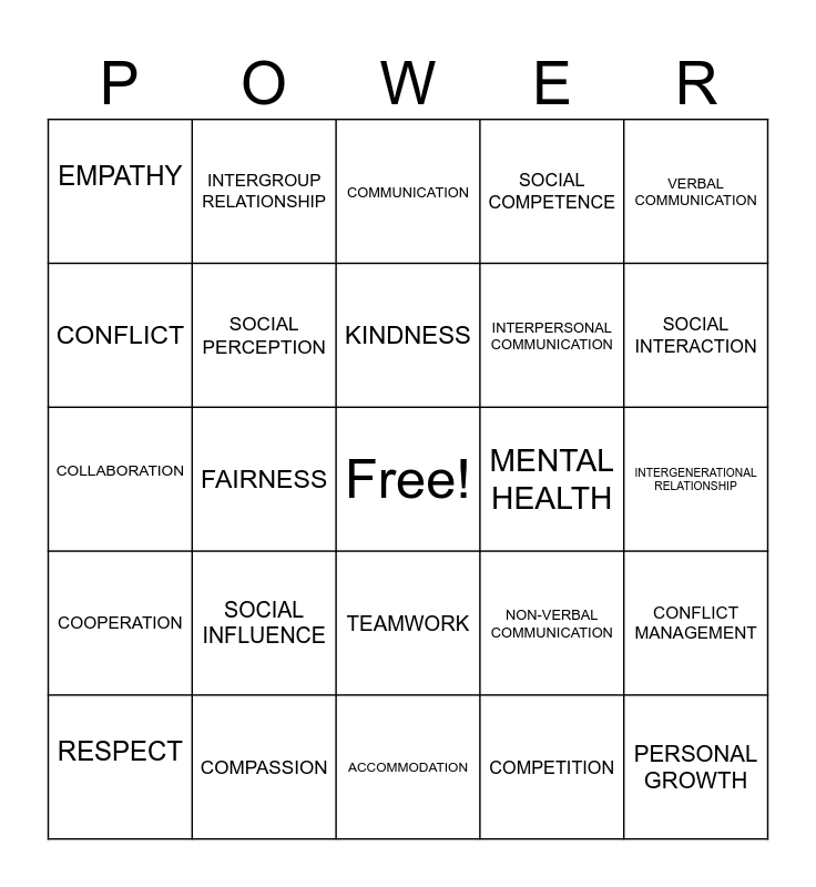 This bingo card has a free space and 24 words: RESPECT, SOCIAL INFLUENCE, KINDNESS, COMPETITION, VERBAL COMMUNICATION, EMPATHY, INTERGROUP RELATIONSHIP, COMMUNICATION, MENTAL HEALTH, INTERGENERATIONAL RELATIONSHIP, COLLABORATION, SOCIAL PERCEPTION, NON-VERBAL COMMUNICATION, CONFLICT MANAGEMENT, CONFLICT, COMPASSION, ACCOMMODATION, SOCIAL COMPETENCE, SOCIAL INTERACTION, COOPERATION, FAIRNESS, TEAMWORK, INTERPERSONAL COMMUNICATION and PERSONAL GROWTH.
