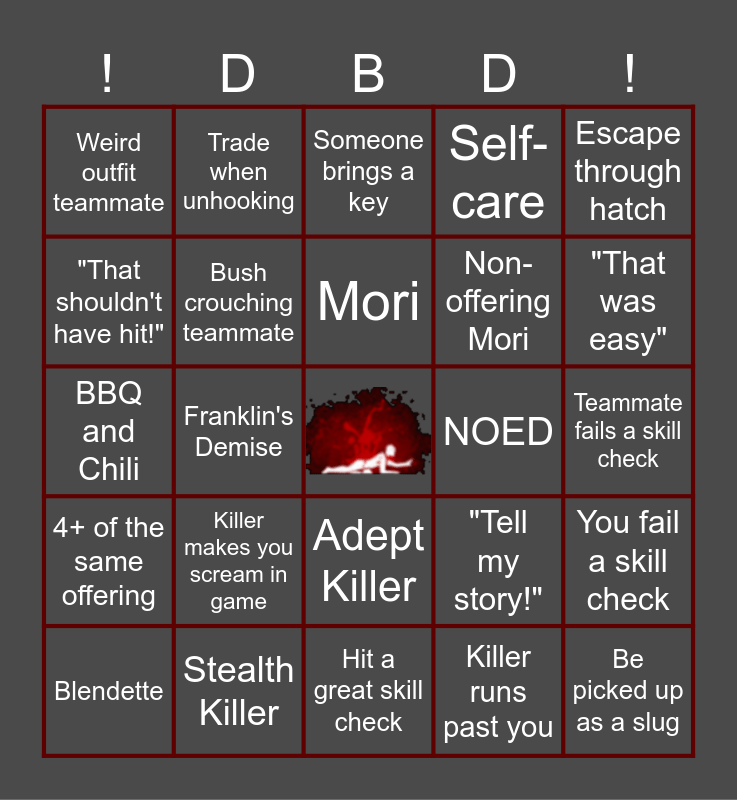 This bingo card has a free space and 86 words: Camping Killer, Adept survivor, Adept Killer, Tunneling Killer, Break a Hex Totem, Demodoggy, Dead Dawg Saloon, Xenokitty, Kobe, Dad-slinger, Spot an already broken totem, Someone down in the first 30 second, You fail a skill check, Teammate fails a skill check, Overcharge, Mori, Hex: Face the Darkness, Indoor map, Outdoor map, Boon Totem, Basement hooking killer, Friendly Killer, BBQ and Chili, Farming Killer, Killer runs past you, All gens done before anyone dies, Survivor Suicides, Lose the killer in chase, Killer DC, Survivor DC, Stealth Killer, Be the obsession, Hex totem destroyed within the first minute, Killer makes you scream in game, "That shouldn't have hit!", "That was dumb", "That was easy", "Stupid!", Multiple of same survivor, Franklin's Demise, Escape with a new item, Get slugged by the killer, Teammate is slugged by the killer, NOED, Corrupt Intervention, Escape through hatch, Left on hook, Trade when unhooking, Get above 45k bp, Agitation / Iron Grasp Killer, Pallet Stun, Map Offering, 4+ of the same offering, 4 man escape, Get sandbagged, Sandbag someone unintentionally, Instadown killer, Non-offering Mori, Self-care, Bush crouching teammate, Weird outfit teammate, Flashlight save, Pallet save, "ggez", Every survivor brings an item, Someone brings a key, Pick up someone slugged, Be picked up as a slug, Unbreakable perk, "My Hubris!", Do 2 or more gens alone, Scare a teammate, Blendette, Spot a Jake in the wild, Play against the Twins, Spot a Mikaela in the wild, Hit a great skill check, Call of Brine, Friends Til the End, "He's an idiot!", "He missed!", Funny teammate name, Roll a 1 on a chest or Bardic, Roll a 20 on a chest or Bardic, "Tell my story!" and *insert thirsty comment*.